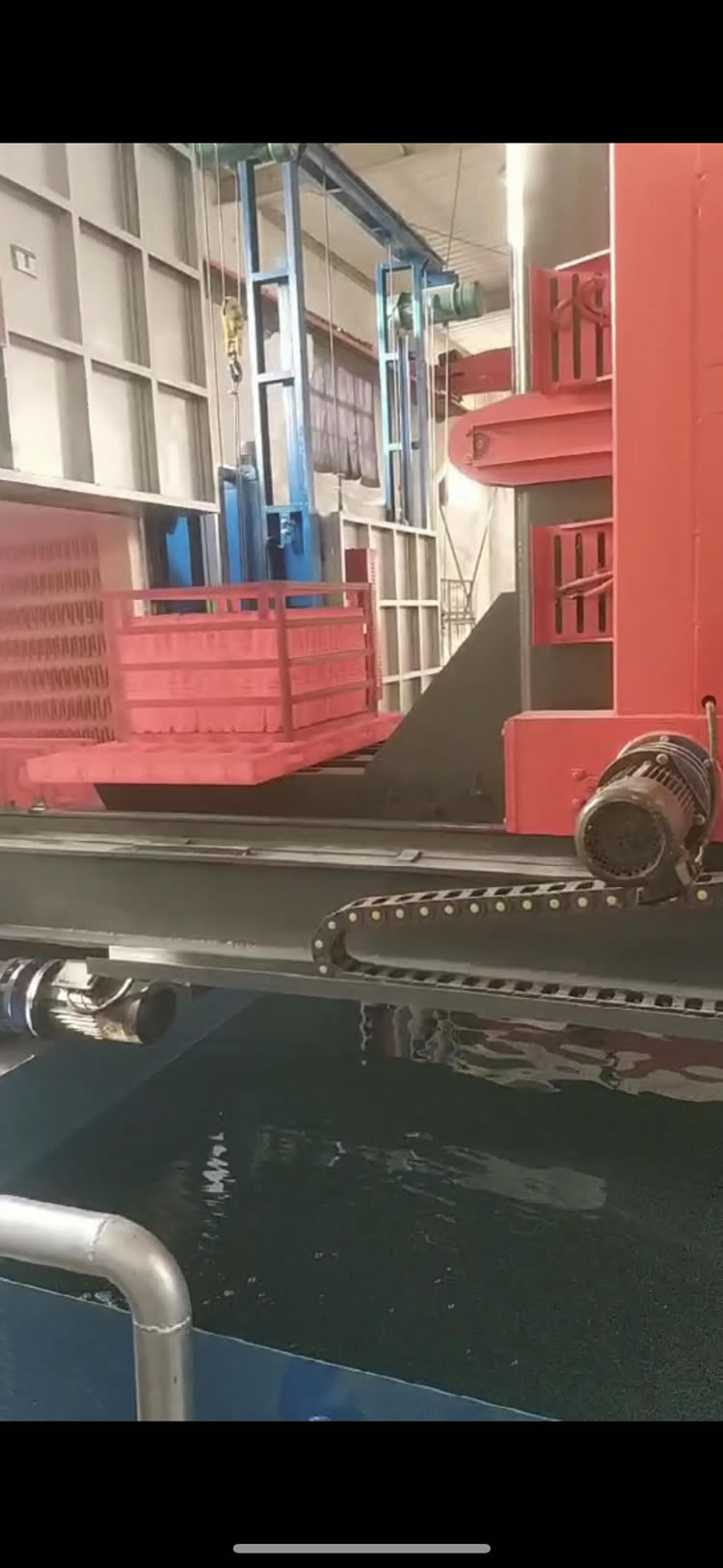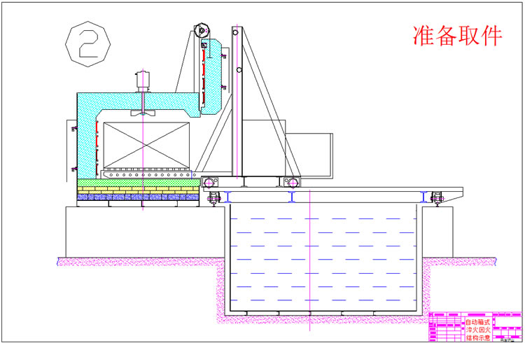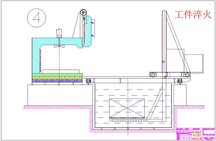 3、出爐淬火:按動(dòng)出爐按鈕——中轉(zhuǎn)車(chē)移動(dòng)到淬火爐爐口——爐門(mén)開(kāi)啟——中轉(zhuǎn)車(chē)把工件移出爐膛——中轉(zhuǎn)車(chē)后退——升降叉下降,工件進(jìn)入淬火介質(zhì)——中轉(zhuǎn)車(chē)帶動(dòng)工件在水中左右擺動(dòng)(次數(shù)可調(diào))——中轉(zhuǎn)車(chē)上升瀝水——淬火工作完成